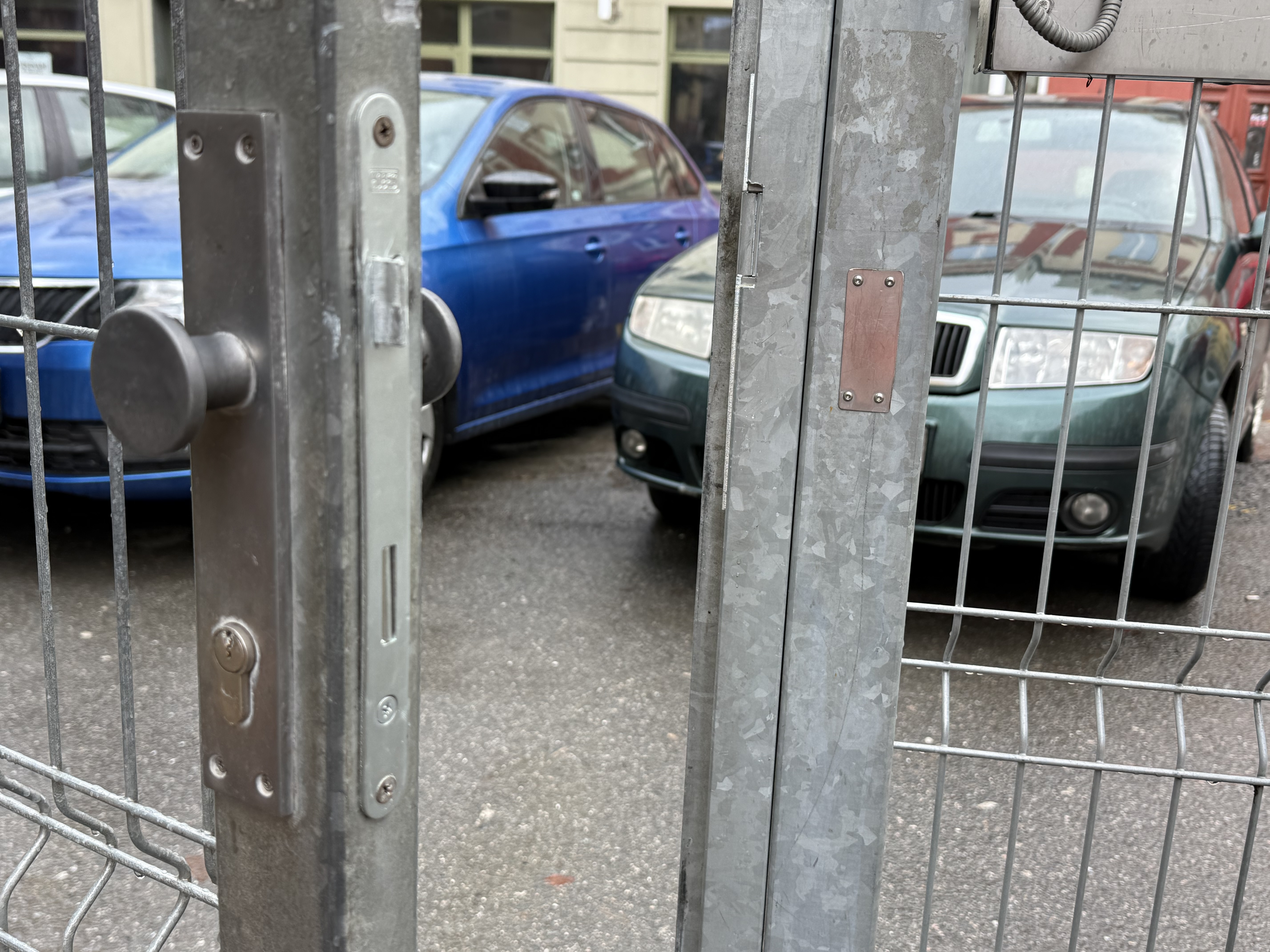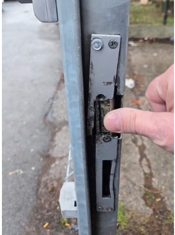 Včera bylo nahlášeno poškození elektrického zámku u vchodové branky. Již jednou byl tento zámek opravován a nyní dosloužil úplně. Při snaze o vykopnutí byl vniřní mechanizmus neopravitelně poškozen ulomením vodící hřídelky západky. Dnes byl zámek vyměněn za nový kvalitní značky FAB. Bylo nutné lehce zvětšit otvor pro zasunutí zámku. Zámek je trochu hlučnější než předchozí ale jeví se jako bytelnější a odolnější útokům.